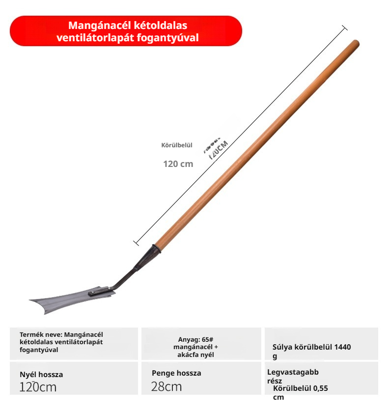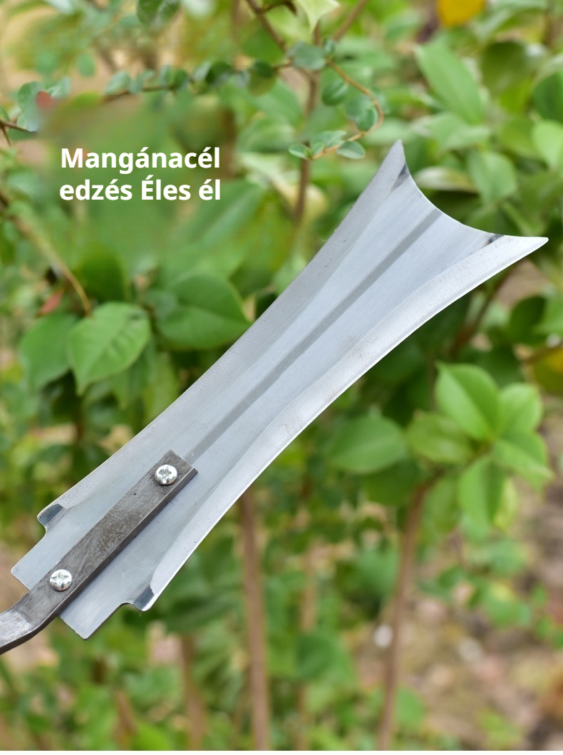 Kétoldalas, hosszú nyelű kés speciális szerszám földtisztításhoz